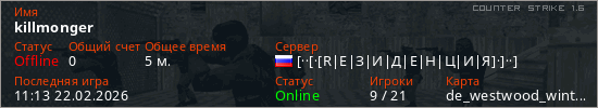 Играет на Counter Strike 1.6 сервере. Страна: РоссияПервый раз замечен 11:09 22.02.2026