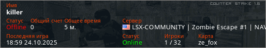 Играет на Counter Strike 1.6 сервере. Страна: СШАПервый раз замечен 18:55 24.10.2025