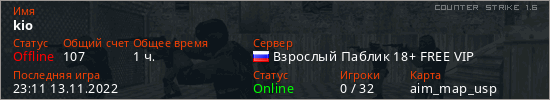 Играет на Counter Strike 1.6 сервере. Страна: РоссияПервый раз замечен 12:26 10.02.2022