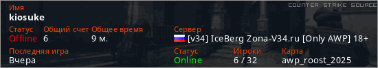 Играет на Counter Strike Source сервере. Страна: РоссияПервый раз замечен 18:41 04.03.2026