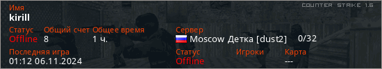 Играет на Counter Strike 1.6 сервере. Страна: РоссияПервый раз замечен 14:21 17.01.2022