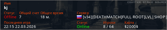 Играет на Counter Strike Source сервере. Страна: РоссияПервый раз замечен 22:13 16.03.2026