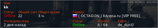 Играет на Counter Strike Source сервере. Страна: РоссияПервый раз замечен 09:47 24.05.2020