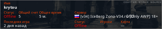 Играет на Counter Strike Source сервере. Страна: РоссияПервый раз замечен 09:33 19.04.2026