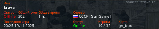 Играет на Counter Strike 1.6 сервере. Страна: РоссияПервый раз замечен 17:12 07.07.2023