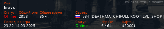 Играет на Counter Strike Source сервере. Страна: РоссияПервый раз замечен 23:06 15.06.2023