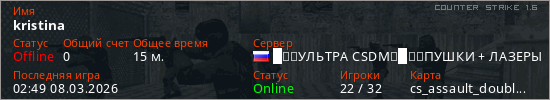Играет на Counter Strike 1.6 сервере. Страна: РоссияПервый раз замечен 06:38 04.03.2026