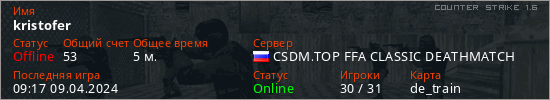 Играет на Counter Strike 1.6 сервере. Страна: РоссияПервый раз замечен 09:14 09.04.2024