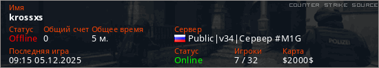 Играет на Counter Strike Source сервере. Страна: РоссияПервый раз замечен 09:11 05.12.2025