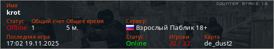 Играет на Counter Strike 1.6 сервере. Страна: РоссияПервый раз замечен 17:00 19.11.2025