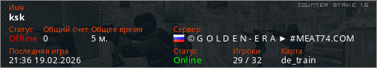 Играет на Counter Strike 1.6 сервере. Страна: РоссияПервый раз замечен 21:19 19.02.2026