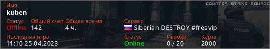 Играет на Counter Strike Source сервере. Страна: РоссияПервый раз замечен 21:44 27.01.2023