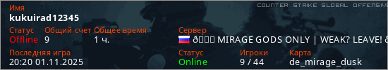 Играет на Counter Strike Global Offensive сервере. Страна: РоссияПервый раз замечен 17:28 14.12.2024