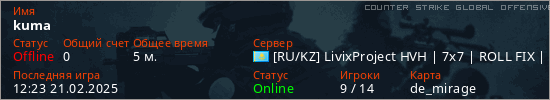 Играет на Counter Strike Global Offensive сервере. Страна: КазахстанПервый раз замечен 12:21 21.02.2025