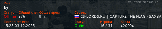 Играет на Counter Strike 1.6 сервере. Страна: РоссияПервый раз замечен 00:25 14.09.2021