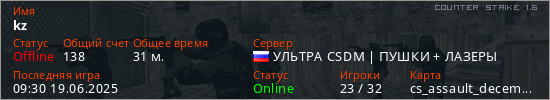 Играет на Counter Strike 1.6 сервере. Страна: РоссияПервый раз замечен 21:44 18.12.2024