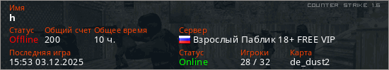 Играет на Counter Strike 1.6 сервере. Страна: РоссияПервый раз замечен 20:19 26.10.2019