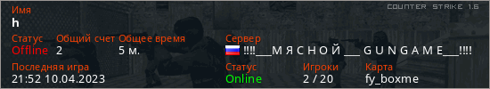 Играет на Counter Strike 1.6 сервере. Страна: РоссияПервый раз замечен 21:40 10.04.2023