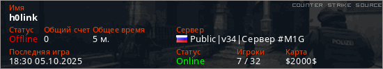 Играет на Counter Strike Source сервере. Страна: РоссияПервый раз замечен 18:28 05.10.2025