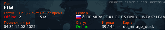 Играет на Counter Strike Global Offensive сервере. Страна: РоссияПервый раз замечен 04:29 12.08.2025