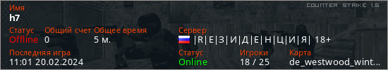 Играет на Counter Strike 1.6 сервере. Страна: РоссияПервый раз замечен 10:34 20.02.2024