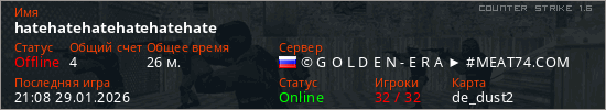 Играет на Counter Strike 1.6 сервере. Страна: РоссияПервый раз замечен 01:07 18.01.2026
