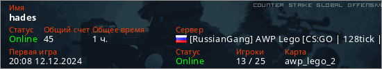 Играет на Counter Strike Global Offensive сервере. Страна: РоссияПервый раз замечен 20:08 12.12.2024