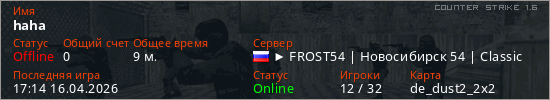 Играет на Counter Strike 1.6 сервере. Страна: РоссияПервый раз замечен 16:22 15.04.2026