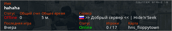 Играет на Counter Strike 1.6 сервере. Страна: РоссияПервый раз замечен 09:11 20.03.2026
