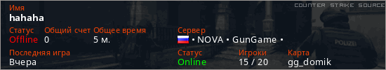 Играет на Counter Strike Source сервере. Страна: РоссияПервый раз замечен 20:59 19.03.2026