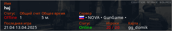 Играет на Counter Strike Source сервере. Страна: РоссияПервый раз замечен 20:57 13.04.2025