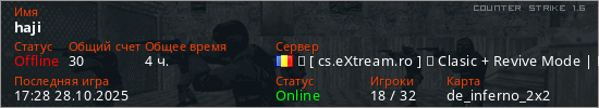 Играет на Counter Strike 1.6 сервере. Страна: РумынияПервый раз замечен 13:08 07.01.2025