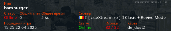 Играет на Counter Strike 1.6 сервере. Страна: РумынияПервый раз замечен 15:23 22.04.2025