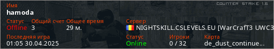 Последний раз был в сети 01:05 30.04.2025 Игрок с таким ником замечен на 3 серверах