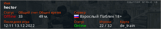 Играет на Counter Strike 1.6 сервере. Страна: РоссияПервый раз замечен 00:46 05.12.2021