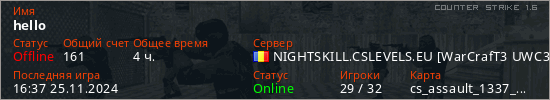 Последний раз был в сети 16:37 25.11.2024 Игрок с таким ником замечен на 53 серверах