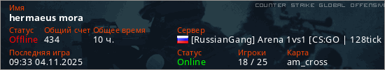 Играет на Counter Strike Global Offensive сервере. Страна: РоссияПервый раз замечен 13:25 24.10.2024