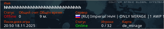 Играет на Counter Strike Global Offensive сервере. Страна: РоссияПервый раз замечен 20:03 18.11.2025