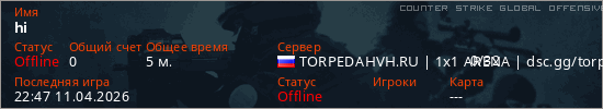 Играет на Counter Strike Global Offensive сервере. Страна: РоссияПервый раз замечен 22:26 11.04.2026