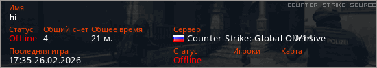 Играет на Counter Strike Source сервере. Страна: РоссияПервый раз замечен 18:25 21.09.2025