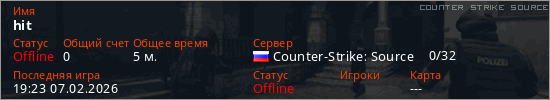 Играет на Counter Strike Source сервере. Страна: РоссияПервый раз замечен 18:23 07.02.2026