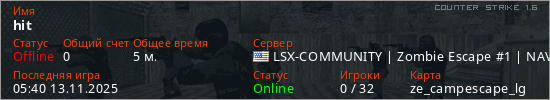 Играет на Counter Strike 1.6 сервере. Страна: СШАПервый раз замечен 05:38 13.11.2025