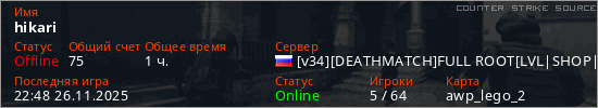 Играет на Counter Strike Source сервере. Страна: РоссияПервый раз замечен 23:10 21.11.2025