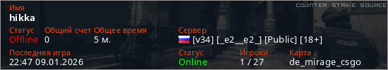 Играет на Counter Strike Source сервере. Страна: РоссияПервый раз замечен 22:45 09.01.2026
