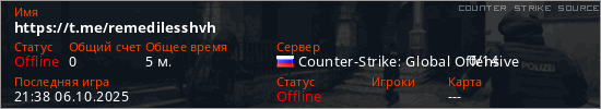 Играет на Counter Strike Source сервере. Страна: РоссияПервый раз замечен 21:34 06.10.2025