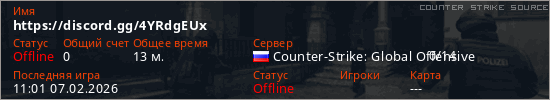 Играет на Counter Strike Source сервере. Страна: РоссияПервый раз замечен 19:11 06.02.2026
