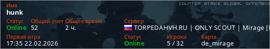 Играет на Counter Strike Global Offensive сервере. Страна: РоссияПервый раз замечен 17:35 22.02.2026