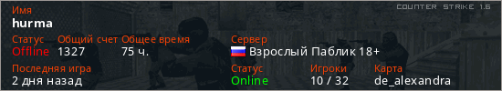 Играет на Counter Strike 1.6 сервере. Страна: РоссияПервый раз замечен 20:37 21.11.2019