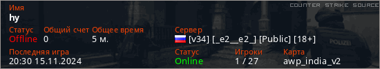 Играет на Counter Strike Source сервере. Страна: РоссияПервый раз замечен 20:04 15.11.2024