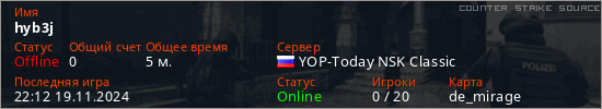 Играет на Counter Strike Source сервере. Страна: РоссияПервый раз замечен 21:51 19.11.2024